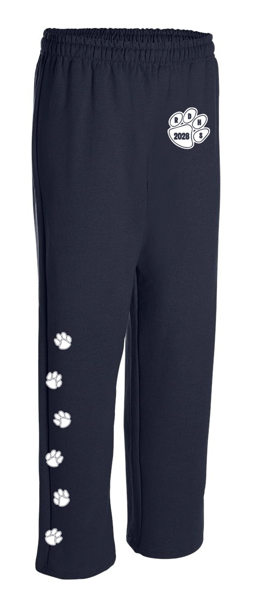 The Class of 2028 Navy Open Bottom Sweatpants feature two print locations in white ink. The first is a white paw with RDHS and 2028 on the left hip. The second is small white paw prints down the outside of the right leg.